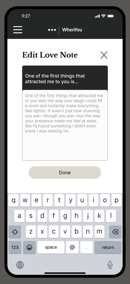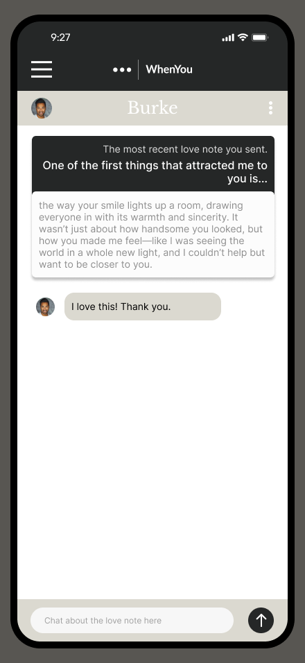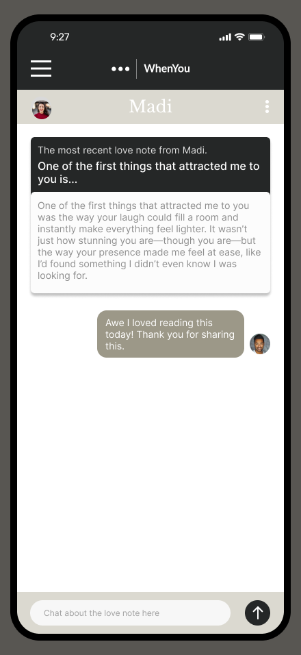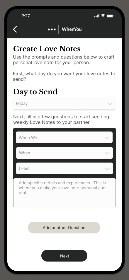 Building and maintaining a strong emotional connection is essential in any romantic relationship. However, with the demands of modern life, finding meaningful ways to express love and appreciation can often fall by the wayside. WhenYou is designed to rekindle and nurture love between couples. Through personalized weekly "Love Notes" and thoughtful prompts, the app provides couples with a unique and interactive way to deepen their emotional bonds.